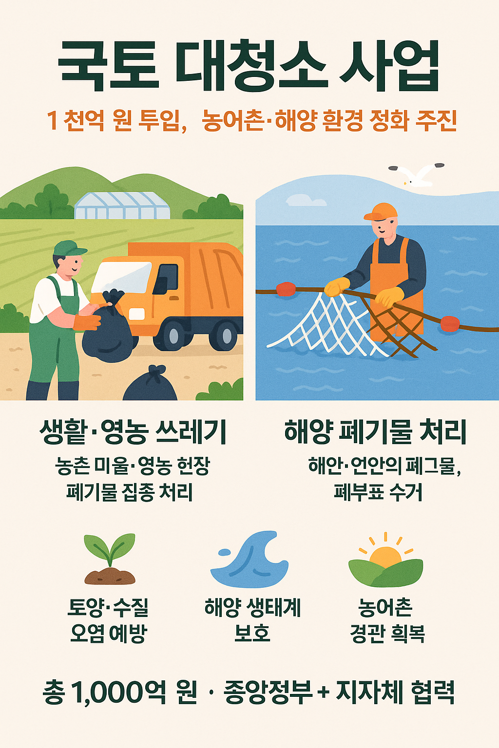 정부는 2025년 예산안에 국토 대청소 사업을 신규 반영했습니다. 총 1천억 원 규모로 추진되는 이 사업은 농어촌 지역의 생활·영농 쓰레기와 연안·해안 지역의 해양 폐기물을 체계적으로 수거·처리하여 깨끗한 국토와 건강한 해양 생태계를 복원하는 것을 목표로 합니다.