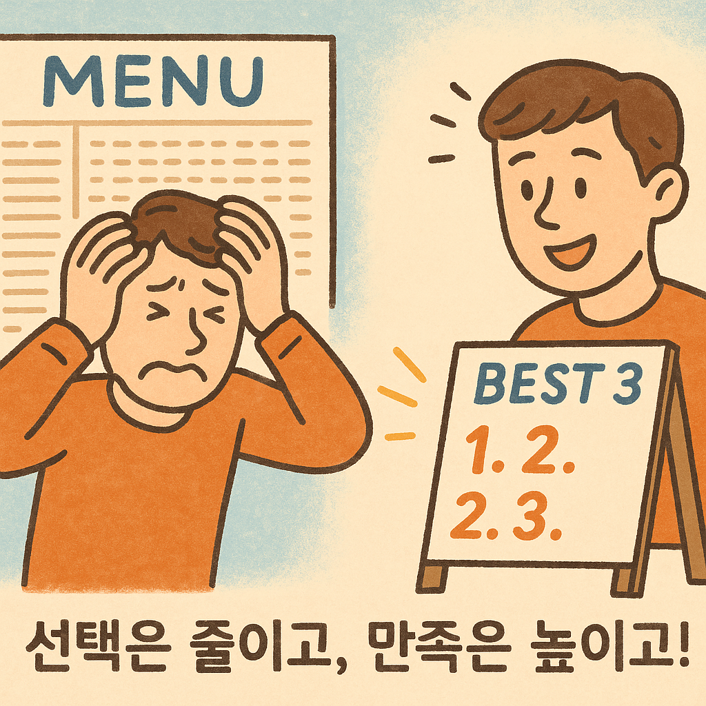심리학 연구에 따르면, 옵션이 많을수록 사람들은 더 오래 고민하고, ‘실패에 대한 두려움’이 커져 결정을 미루거나 포기하는 경우가 많습니다.