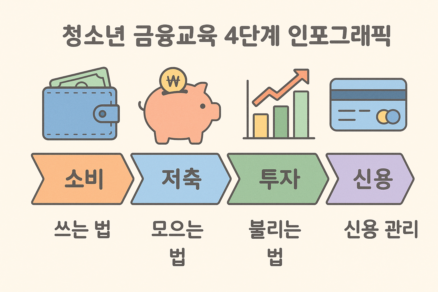금융교육은 복잡한 개념을 가르치는 것이 아니라, 소비 → 저축 → 투자 → 신용이라는 4단계 구조를 이해시키는 데서 출발합니다.