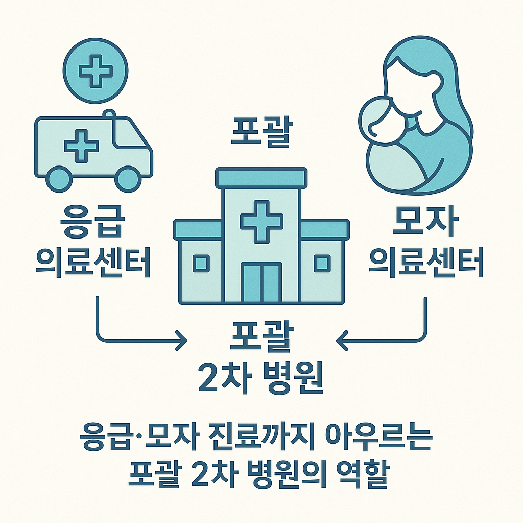 - 포괄 2차 종합병원 제도화 - 2025년 기준 175개 종합병원 지정 - 지역거점병원으로서 내과·외과·산부인과·소아청소년과 필수 진료 제공 - 지정 병원에 시설·장비·인력 지원
