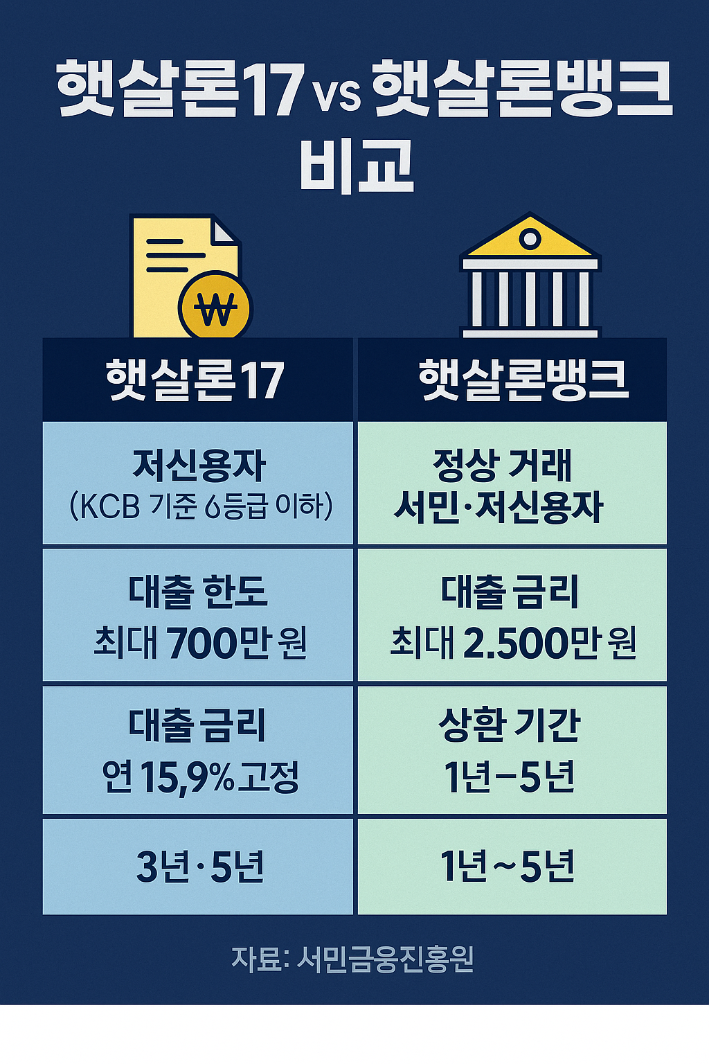 고금리 시대에 서민·저신용자가 가장 많이 비교하는 정책성 대출이 햇살론17과 햇살론뱅크입니다. 이름은 비슷하지만 금리·한도·심사 기준·대상이 완전히 다르기 때문에, 구조를 제대로 이해한 뒤 신청 순서를 정하는 것이 중요합니다.