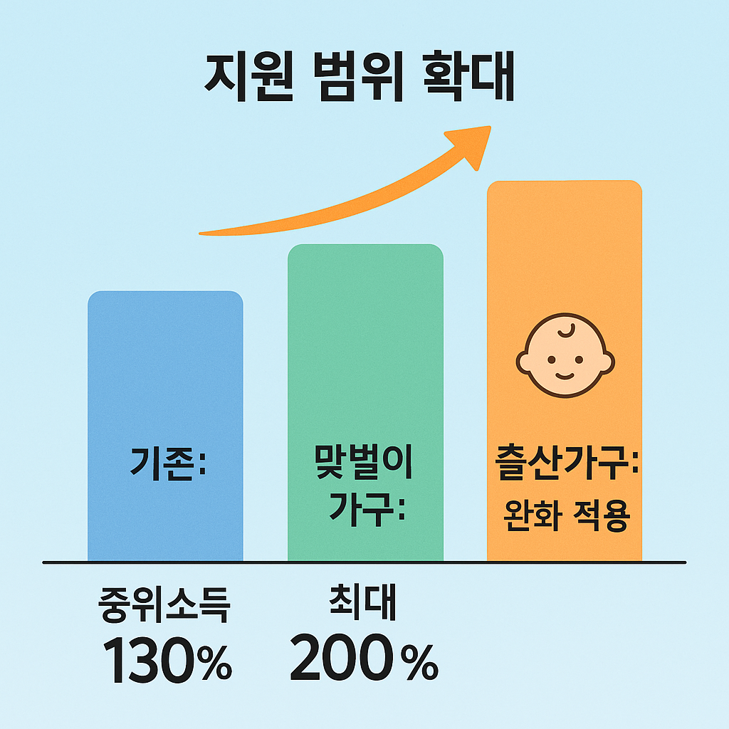 - 출산가구: 자녀 수에 따라 소득 기준 10~20%p 완화