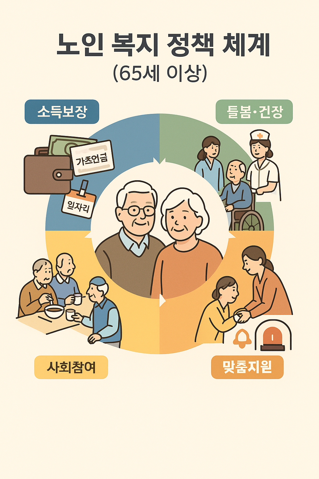 정부는 65세 이상 노인의 안정적 노후를 위해 소득 보장(기초연금·노인일자리), 돌봄·건강(노인장기요양보험·의료비 지원), 취약노인 맞춤 지원(노인맞춤돌봄·응급안전안심), 사회참여·생활지원(경로당 주 5일 급식 등)을 확정·시행 중입니다. 본 글은 2025년 현재 시행·확정된 공식 자료만을 근거로 정리했습니다. (근거: 보건복지부·정부 정책브리핑 등)