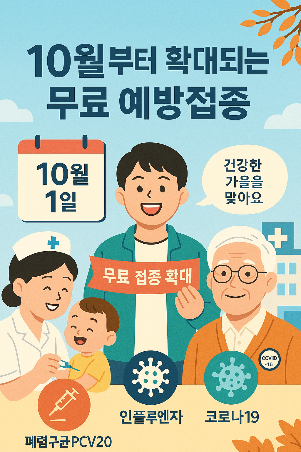 핵심 키워드: 무료 예방접종, 필수예방접종 확대, 10월부터, 국가예방접종, 지원 연령, 폐렴구균 PCV20, 인플루엔자, 코로나19 임시예방접종