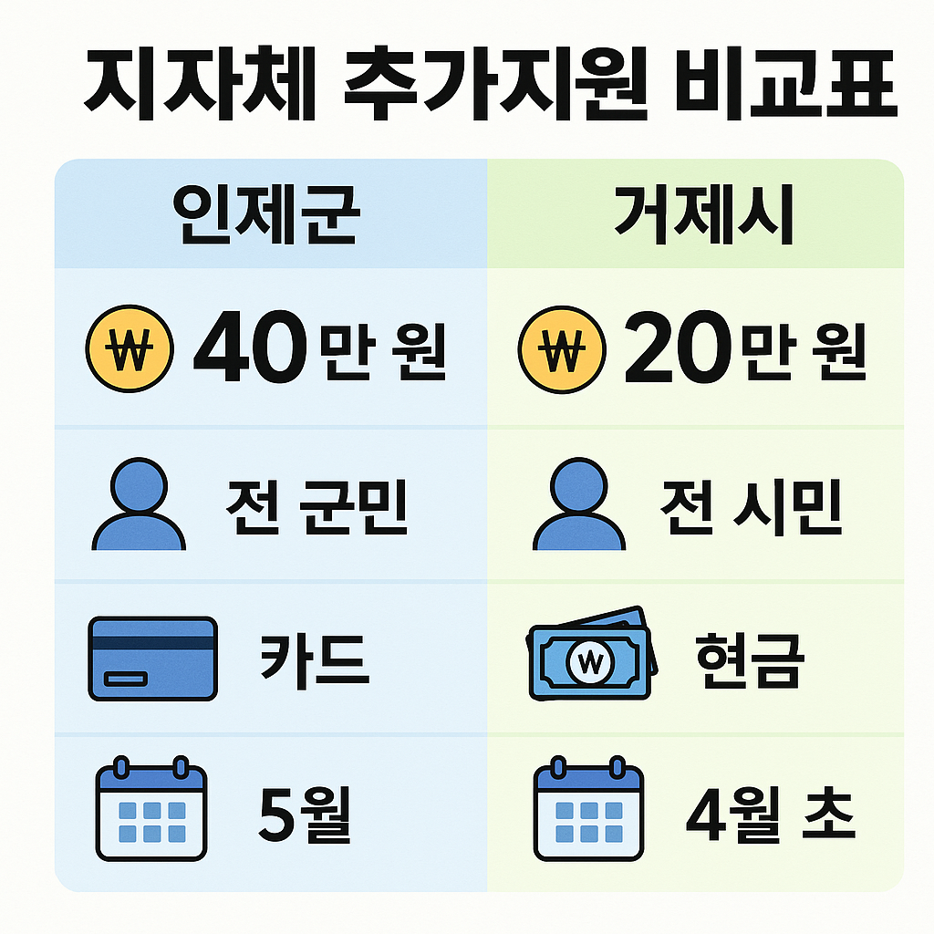 설명: 인제군·거제시의 지원금, 대상, 지급 수단, 시기를 표로 정리