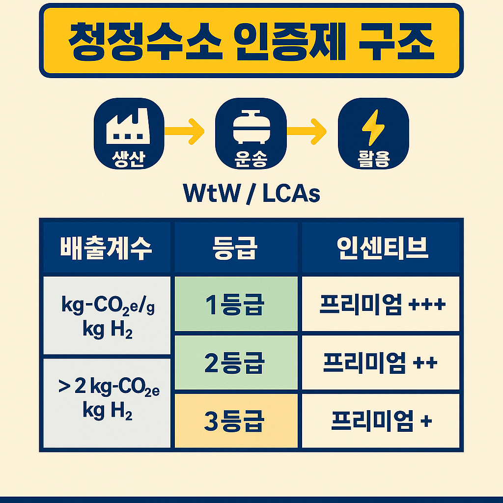 청정수소 인증제는 생산 단계의 온실가스 배출량을 기준으로 등급을 부여해 정책지원 및 시장 신뢰를 높이는 제도입니다. 정부는 2023년 11월 시행령 개정을 통해 인증 기준·절차·사후관리·인증기관 지정 근거를 확정했고, 2024년 3월부터 시범사업을 시작했습니다. 2025년에는 시범 결과를 토대로 본격적 인증·유통 생태계가 운영됩니다.