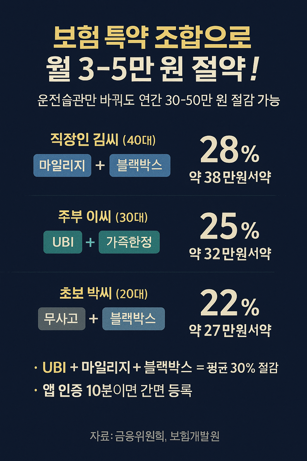 - 🚙 30대 주부 이씨: UBI 점수 90점 달성 → 추가 15% 할인, 가족한정 특약으로 10만 원 추가 절감