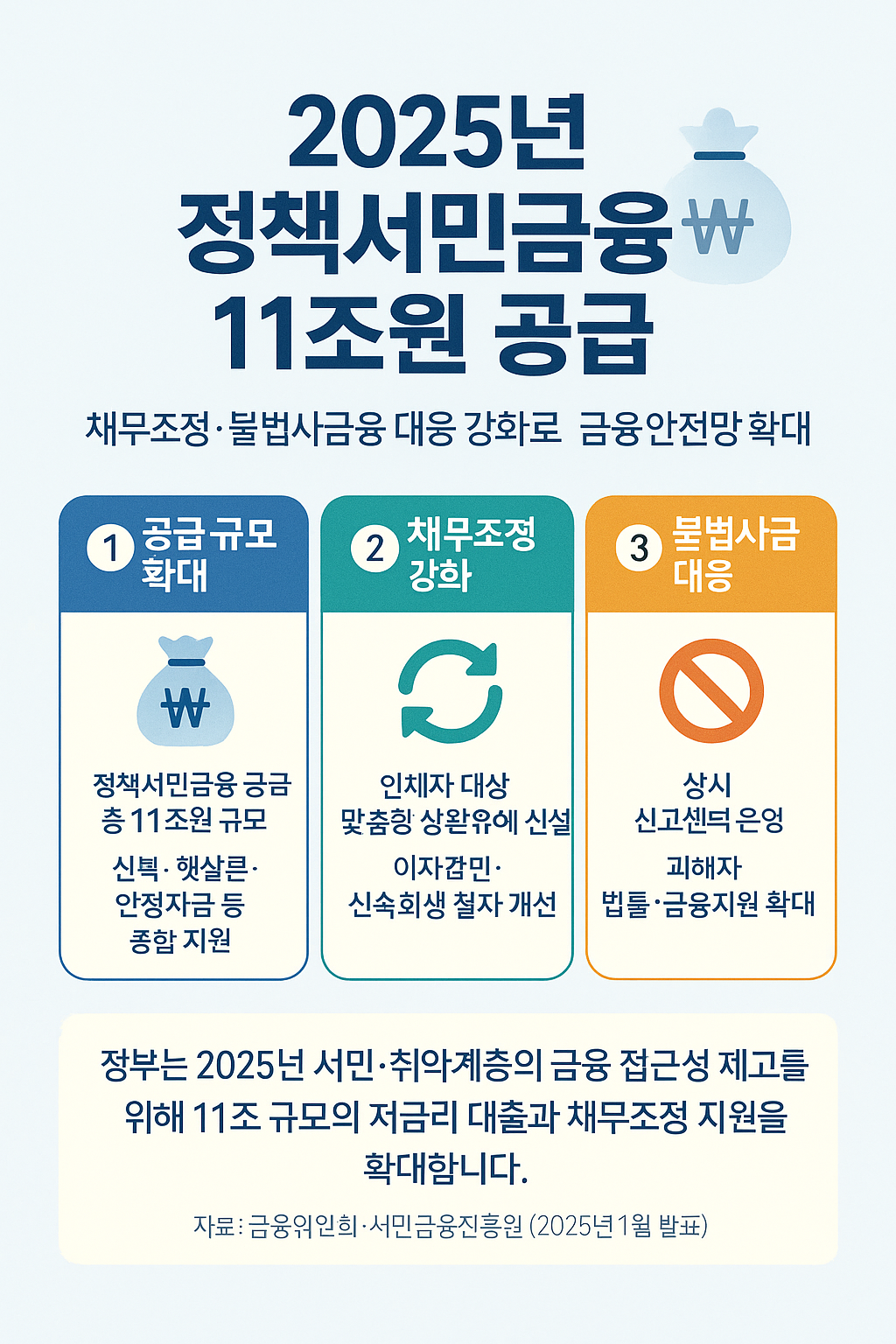 첫째, 공급 확대 — 금융위원회는 2025년 서민금융협의회에서 정책서민금융을 전년 10조 → 11조 원으로 확대하기로 확정했습니다. 이는 서민·취약계층 대상의 정부 지원 대출 공급을 늘리겠다는 방침입니다.