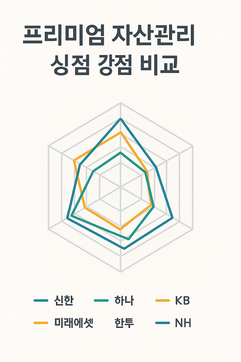 프리미엄 자산관리 선택은 서비스 범위·전문가 조직·대체투자·채널·최소자산 다섯 축의 객관적 비교에서 출발합니다. 공개된 공식 안내/공고만으로도 각 기관의 강점은 뚜렷합니다. 신한 Premier/PWM은 융합점포·패밀리오피스 라인업, 하나 골드클럽은 지역 거점 PB센터, KB WM은 스타자문단의 전문가 네트워크, 미래에셋은 디지털PB와 대형 플랫폼, 한국투자증권은 PB운용형 랩의 명확한 최소가입 기준, NH는 패밀리오피스 전담조직이 특징입니다. [1][2][3][4][6][12][14]