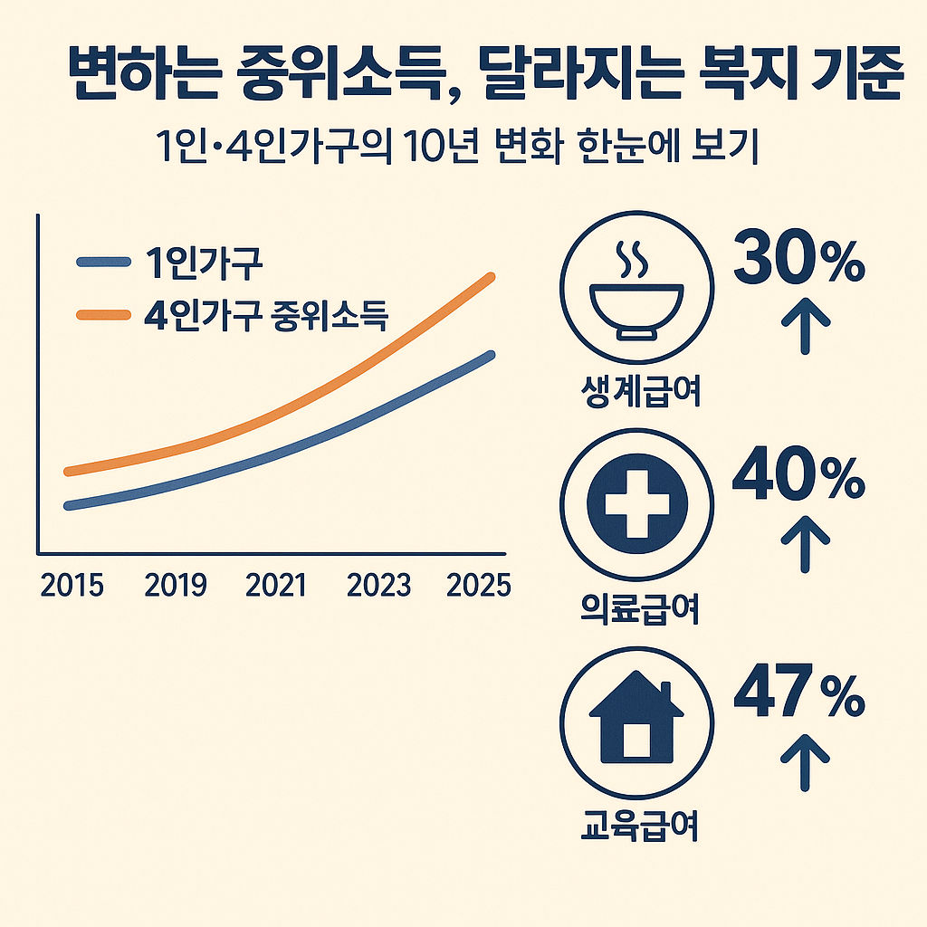 - 2025년: 기준 중위소득 6.42% 인상. 4인가구 6,097,773원, 1인가구 2,392,013원. 급여별 선정기준(생계 32·의료 40·주거 48·교육 50) 유지.