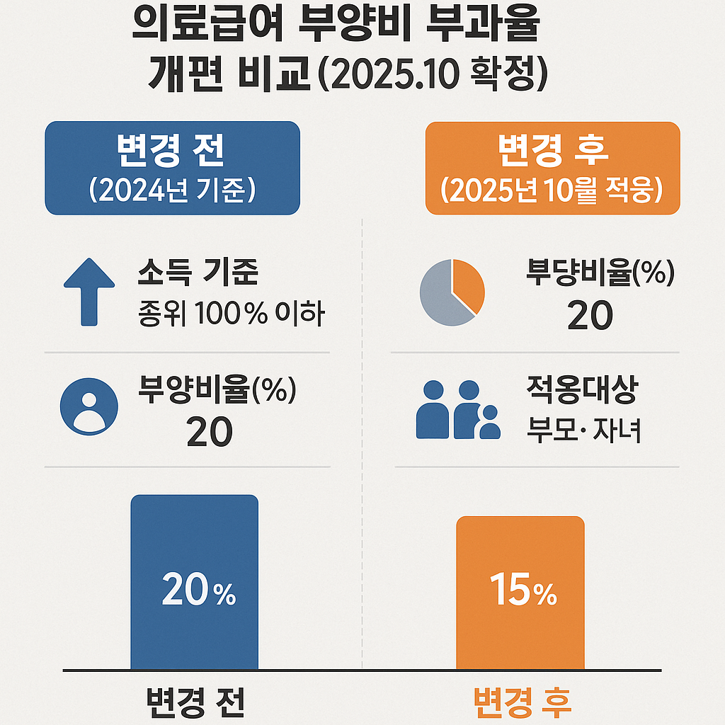 - 2025년 10월: 의료급여 부양비 일괄 10% 적용(이전 15%/30% → 10%).