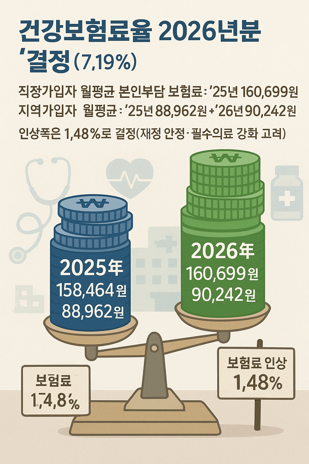 2026년 건강보험료율 인상은 소폭이지만 의미 있는 조정입니다. 직장가입자와 지역가입자 모두 월평균 소액의 부담이 늘어나지만, 건강보험 재정 안정과 필수 의료 보장 강화를 위한 불가피한 선택입니다.