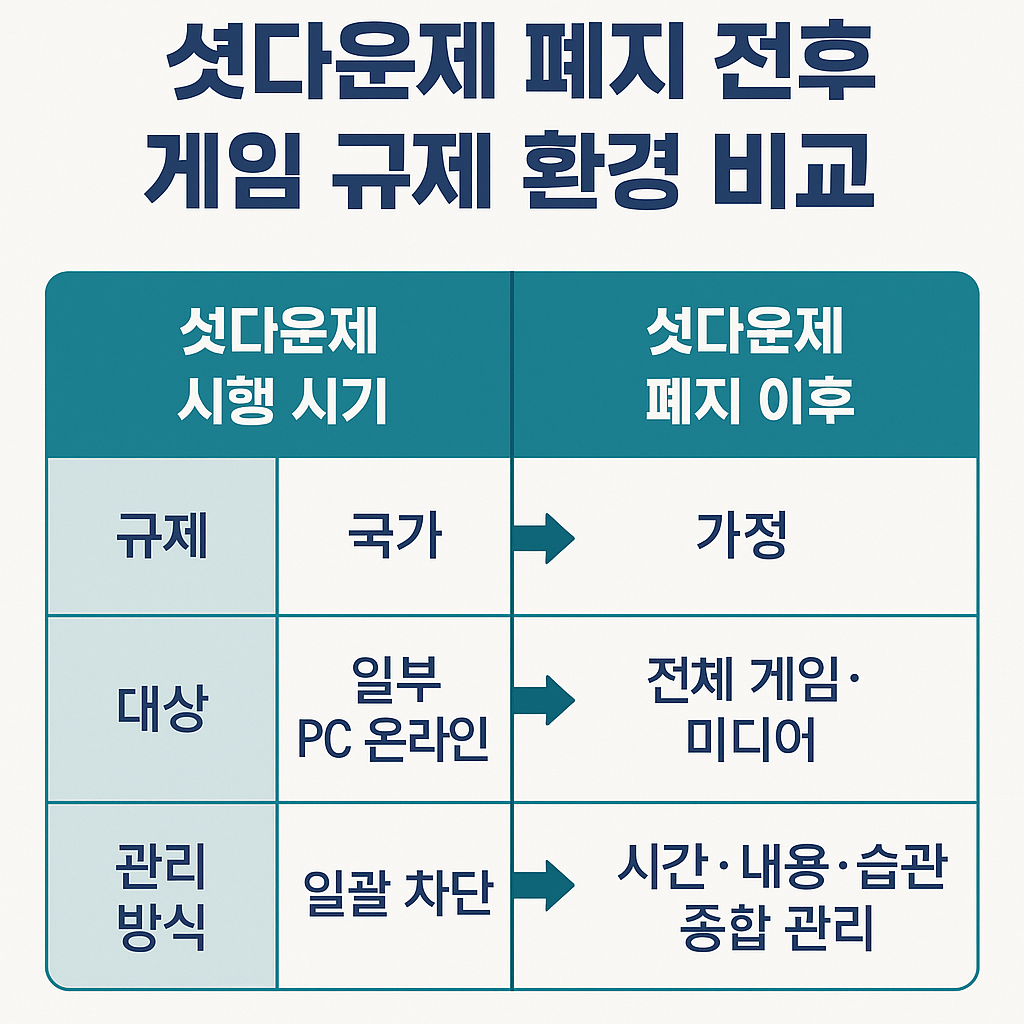 정리하면, 셧다운제 폐지는 “게임 제한이 사라졌다”가 아니라 “국가 대신 가정이 전면에 나섰다”로 보는 것이 현실에 더 가깝습니다.