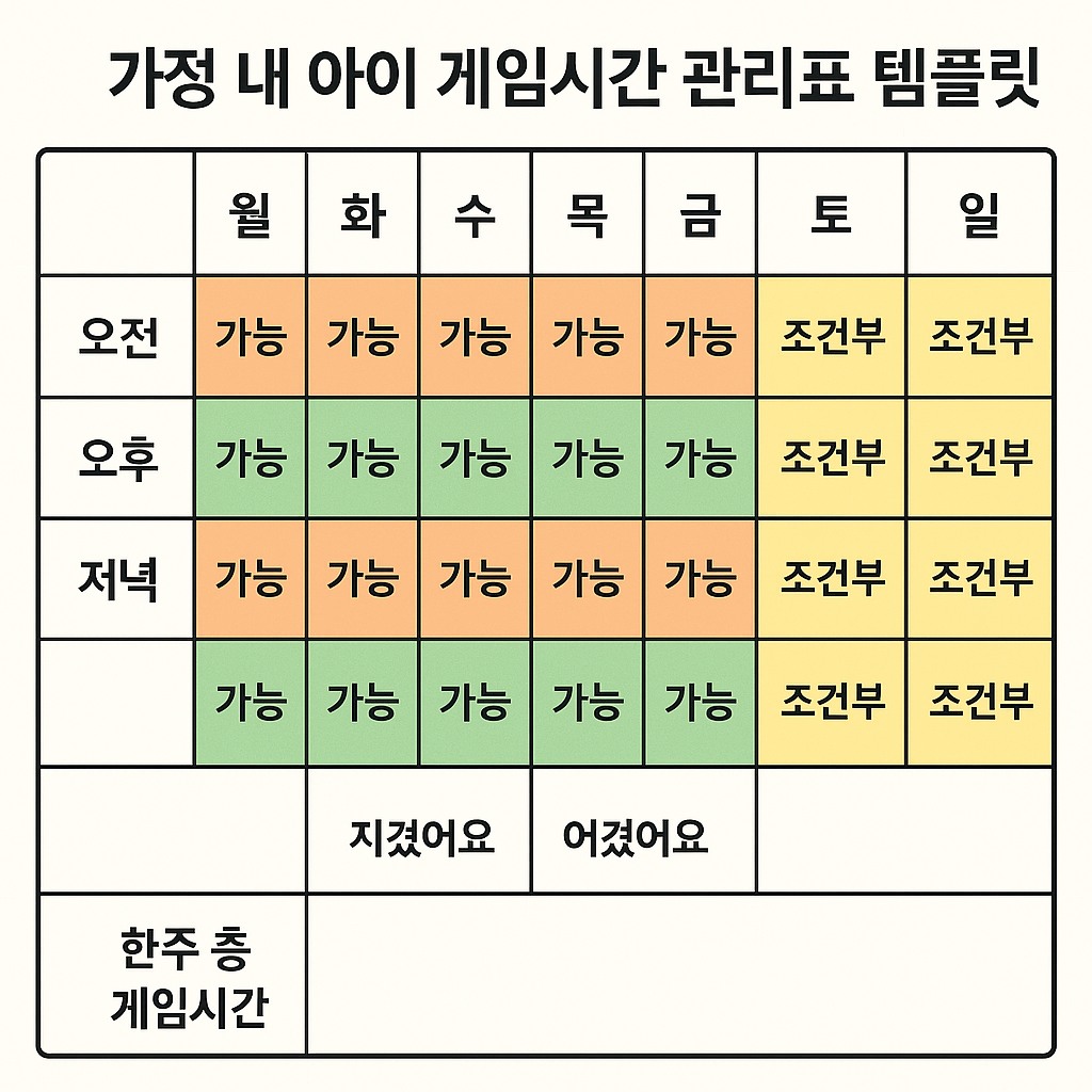이렇게 시각화된 관리표를 냉장고나 거실 벽에 붙여 두면, 부모가 매번 잔소리하지 않아도 게임시간 관리가 자연스럽게 습관화됩니다.