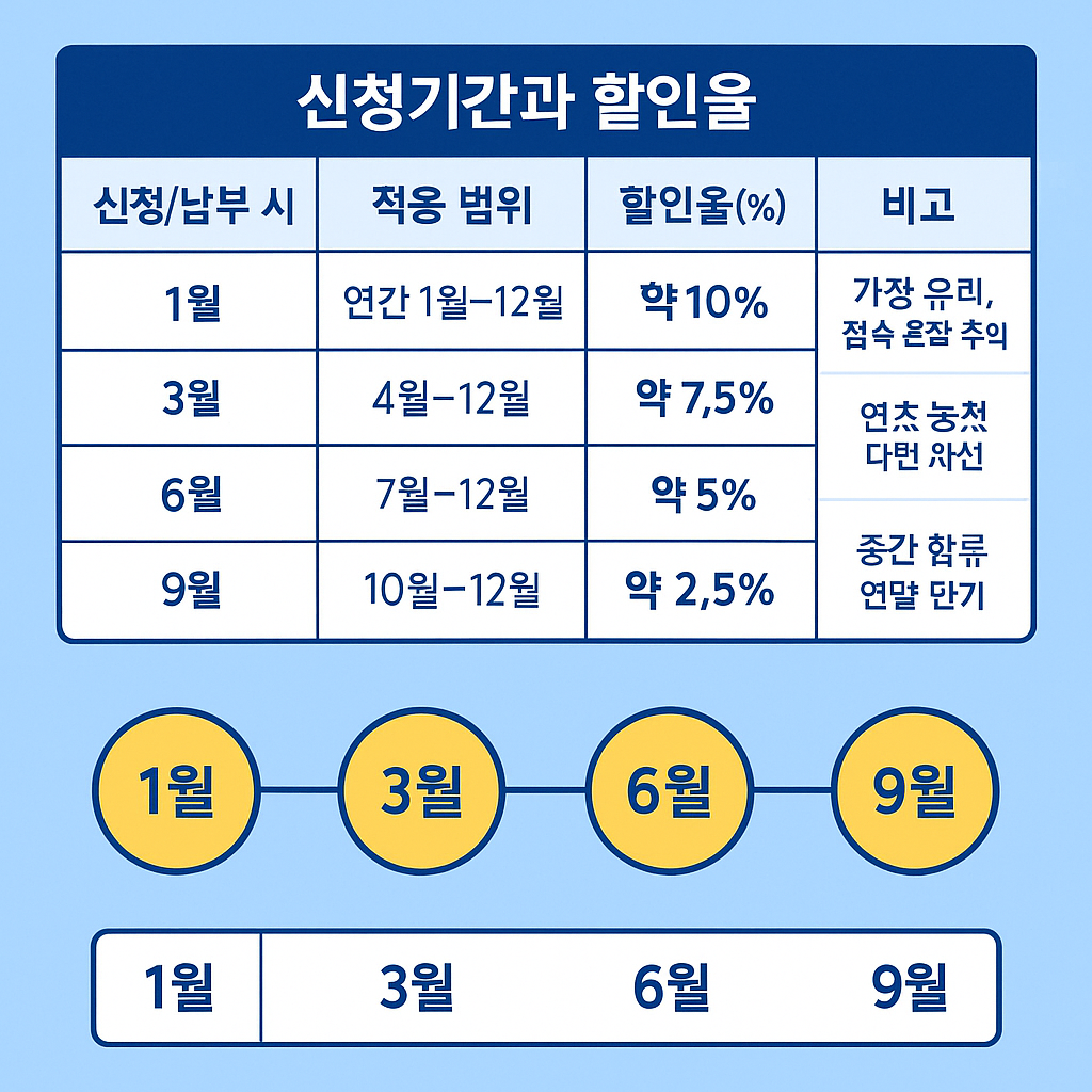 | 신청 시기 | 적용 기간 | 실효 공제율(2025 기준) | 비고 |