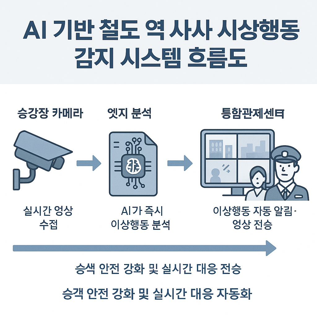 이어 정부는 폭행, 승강장 추락, 쓰러짐 등 이상행동을 자동 감지하는 AI 기능을 철도 치안·안전용 CCTV에 시범 도입 후 적용 범위를 확대하겠다고 공식적으로 설명했습니다(국토교통부 참고·설명자료, 2023-10-29).
